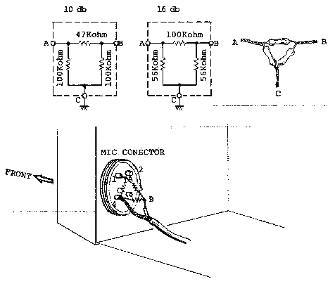 When using a high output microphone (i.e. Shure 444), it is very likely that there will be distortion of the transmitted audio if the processor is used. The reason the distortion occurs is because the processor is between the first microphone amplifier and the microphone gain control. The installation of one of the attenuators shown below will reduce the microphone input to a level that will not cause RF speech processor distortion. The attenuator figures are approximate.